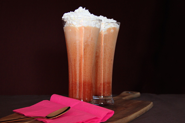 Put all ingredients in a blender and blend to a smooth consistency. Pour mixture into a glass and top with whipped cream.