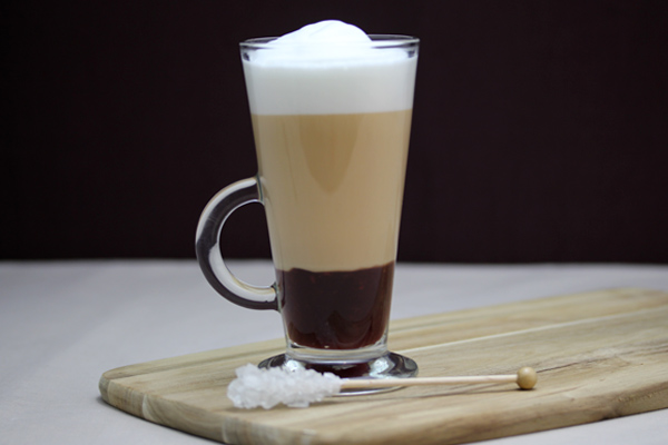 Put 1 tablespoon of the raspberry coulis and a little bit of sugar on the bottom of the glass. Pour the frothed milk into the cup and slowly pour the tea through the center of the frothed milk. Finish with some cinnamon sugar.